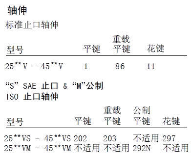 型号 最大几何排量cm³/r 最高压力bar 额定转速r/min 2520V 67轴端 172 1800 45盖端 207 2525V 67轴端 172 67盖端 172 3520V 121轴端 172 45盖端 207 3525V 121轴端 172 67盖端 172 4520V 193轴端 172 45盖端 207 4525V 193轴端 172 67盖端 172 4535V 193轴端 172 121盖端 172